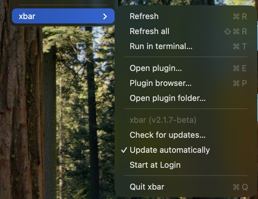 xbar uses the filename to determine refresh intervals:plugin-name.{time}.{extension}1s- Every second10s- Every 10 seconds1m- Every minute5m- Every 5 minutes1h- Every hour1d- Every day
